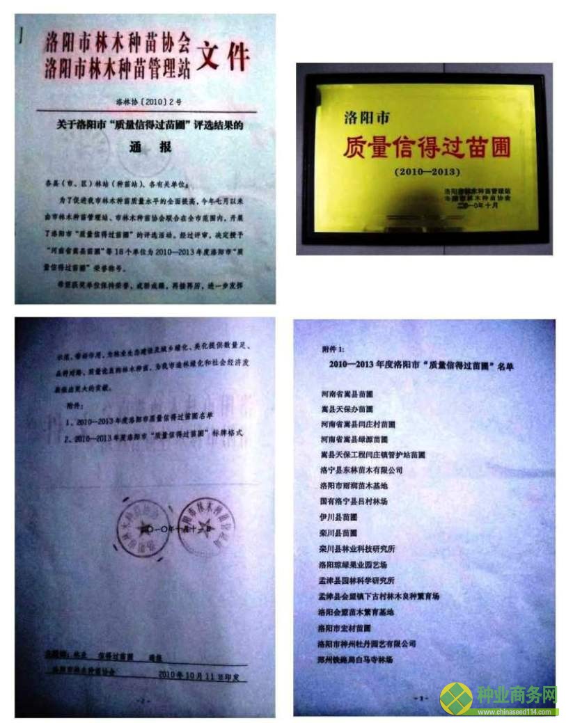 | 發(fā)證機(jī)構(gòu): | 洛陽市林業(yè)種苗協(xié)會、洛陽市林木種苗管理站 | 發(fā)證時間 : | 2010-10-11 |