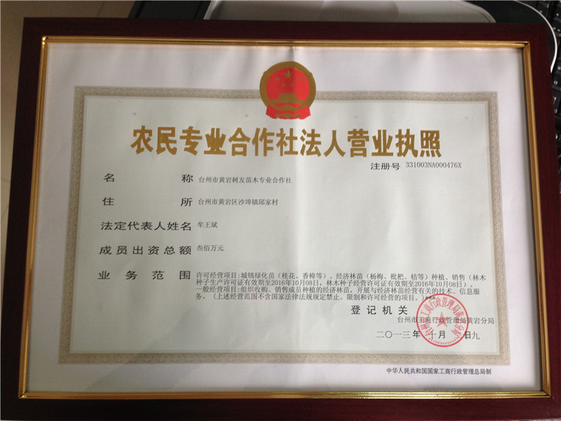 證書介紹 臺州市黃巖樹友苗木專業(yè)合作社,理事長:牟王斌的帶領(lǐng)下本社得到浙江省農(nóng)科院、農(nóng)大、農(nóng)業(yè)廳、林業(yè)廳專家的幫助親臨指導(dǎo),通過精選提高質(zhì)量,培育了一批又一批的優(yōu)質(zhì)果樹苗木,綠化-花卉 苗木,不僅為我省提供優(yōu)良苗木,還為我國的南方各省、市部分地區(qū)提供了優(yōu)良的苗木。銷售往福建、江西、廣東、廣西、湖南、貴州、云南等各地。凡是購我們苗木的客戶沒有一個提出不掛果、不正宗、不受益等意見?,F(xiàn)在本社在中國臺州市林業(yè)研究所重視支持下,再給西部人發(fā)提供優(yōu)良品種,大幅度提高果樹,綠化-花卉 苗木效益,給西部人發(fā)走向致富,我們?nèi)詧猿植恍?,本著品種純正、質(zhì)量保證、踴躍服務(wù)的宗旨。目前我社是國內(nèi)較強楊梅苗/丹桂-桂花苗示范生產(chǎn)基地。規(guī)格齊,質(zhì)量優(yōu),價格實,深受新老客戶的好評,歡迎各位朋友及各經(jīng)銷商前來選購和合作經(jīng)營。