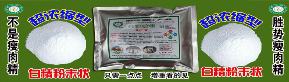 產(chǎn)品特點:使用克侖巴安系列產(chǎn)品----3天后,采食量大增。7天后,糞便減少,臀部開始豐滿。15天后收腹,后臀發(fā)達,體形健美肉色紅潤,背部變寬,背溝深。20天左右豬牛羊只各部位已達豐滿體形。使用期間料肉比可降15%-18%提高日增重20%-25%。使用期限為30-50天,使商品豬牛羊提前出欄,不滴水,防止pse肉的發(fā)生出售商品豬驅(qū)趕時抗應(yīng)激,基本無死亡現(xiàn)象,克侖巴安,快字當先,養(yǎng)殖速成,極限生長,健康生活!快字當先,催肥速成,千家萬戶的驗證:“多、快、好、省”即:吃的多,排的少、生長快、體型好、節(jié)省成本,縮短飼養(yǎng)周期。產(chǎn)品功效:采食極限,促長極限,促使機體內(nèi)源激素生長水平,加快消化代謝速率,增加采食量,抑制脂肪沉積,瘦肉率明顯提高,改變酮體品質(zhì),改善體形。合作對象:具有科技意識、經(jīng)濟頭腦、養(yǎng)殖水平較高的人士。