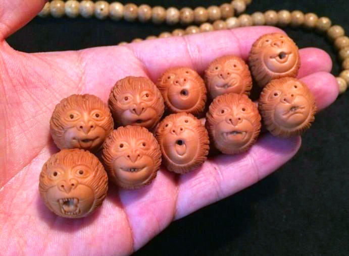 3. 青年人(男):核雕猴頭手串,光珠手串,素珠長串,核雕猴頭(美猴王、八面威風(fēng)猴、怒發(fā)沖冠猴、美女猴),核雕人物(彌勒佛、淑女)。