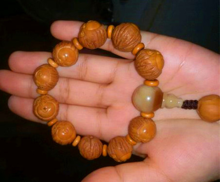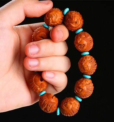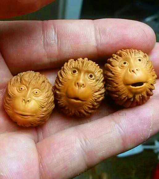 5. 雕刻品用途廣泛,“玩法”多樣。業(yè)內(nèi)人士通常把核雕品的玩法分為三種(有人稱為三種制式),即單個、成對和串活。單個和成對,其實(shí)就是大家常說的掛件和擺件;而串活則指的是作為串珠(念珠),制成手串、項(xiàng)串等。對于果個較大、所雕題材內(nèi)容比較完整的美國猴頭核桃雕刻品,可用作掛件或擺件,例如作為手機(jī)墜、手包墜、扇子墜、汽車內(nèi)掛等,或擺于案頭欣賞、握于手中把玩。對于果個較小、所雕題材相對簡單的美國猴頭核桃雕刻品(通常是猴頭),當(dāng)然是制作手串、長串的首選。需要說明的是,除了雕刻外,對于果形圓、果個小、果殼表面紋路美觀的美國猴頭核桃,就沒有必要雕刻了,直接用素珠穿串,即可成為上品;磨光珠穿串也是一種不錯的選擇。