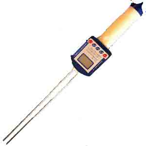 3、測量:把探桿插入糧食中,插到手柄根部,根據(jù)所測糧食品種,從表盤讀出指針相應(yīng)的指示值,加減溫度校正值,即為所測糧食水分測量值。