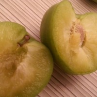 青脆李果實(shí)圓形,平均單果重30克,45克,果柄短,果皮青綠色,果面光滑,果肉厚皮薄,肉質(zhì)脆硬汁多,味甜中帶苦,回味清香甘甜,品質(zhì)上等,可溶性固形物13.8%,果核小,橢圓形,離核,可食率高,耐貯運(yùn)極強(qiáng)。