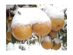 果實經(jīng)濟性狀:晚秋黃梨果形扁圓,個大,平均單果重415克,最大單果重1400克,汁味甜,有哈密瓜的香味,可溶性固形物含量15%,果皮薄,黃褐色,套袋后淡黃褐色,果點大但不明顯,果肉白而致密,石細胞少,清脆可口。