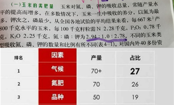 因?yàn)?,玉米每生產(chǎn)100斤籽粒,必須吸收2.28斤純氮,0.78斤純磷,2.25斤純鉀。夏玉米因?yàn)榍安缱魑锓柿狭舸娴脑?,可以以氮肥為主,少用或不用鉀肥。而且,?jù)美國(guó)伊利諾伊州立大學(xué)弗雷教授的科研結(jié)果,玉米用氮肥對(duì)產(chǎn)量的貢獻(xiàn)占26%(高于品種的19%占比,僅次于天氣27%的占比)。