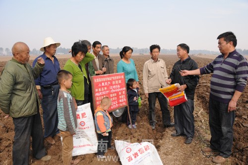 良種加配套良肥是提高糧食單產(chǎn)的根本途徑。示范方由農(nóng)民提供連片土地,天脊集團(tuán)供應(yīng)化肥,河南農(nóng)科院提供種子,縣高產(chǎn)攻關(guān)領(lǐng)導(dǎo)小組提供技術(shù)服務(wù)。采取統(tǒng)一免費(fèi)供肥:在試驗(yàn)田里為農(nóng)戶免費(fèi)供應(yīng)天脊硝酸鱗甲每畝地五十公斤,并進(jìn)行測(cè)土配方科學(xué)施肥;統(tǒng)一供應(yīng)良種:河南省農(nóng)科院提供培育的小麥花培八號(hào)等良種;統(tǒng)一機(jī)耕機(jī)播:縣高產(chǎn)攻關(guān)領(lǐng)導(dǎo)小組為實(shí)驗(yàn)田引進(jìn)大型旋耕機(jī),播種機(jī);統(tǒng)一種植模式:采取寬窄行精良播種;統(tǒng)一技術(shù)服務(wù):邀請(qǐng)農(nóng)業(yè)專家杜學(xué)云等從小麥?zhǔn)┓?,選種,播種,管理等方面全程為農(nóng)民提供服務(wù)。