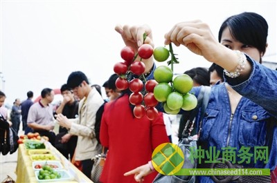 記者在現(xiàn)場看到,五顏六色的番茄掛在枝葉上,還有像西瓜形狀的茄子,引來無數(shù)菜農(nóng)上前咨詢和取經(jīng)。“番茄除了紅色、綠色之外,還有紫色、橙色、粉色、紫紅、黃白,既有觀賞性,口感也非常不錯(cuò)。它的糖度達(dá)10%,比我們現(xiàn)在吃的普通番茄糖度高一倍。這種新品種果子還有一些特點(diǎn),就是不易裂果,抗病性強(qiáng),高產(chǎn)量,每畝產(chǎn)量可達(dá)5000公斤以上。”廣州市農(nóng)業(yè)科學(xué)研究院蔬菜研究所所長林鑒榮表示,“這些都是天然食品,通過基因雜交而成。”