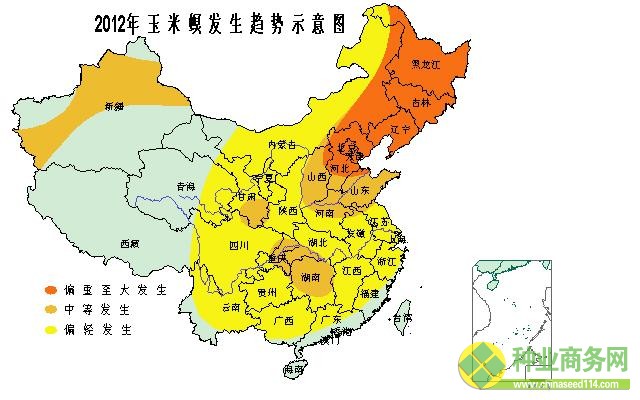 總體偏重發(fā)生,程度重于2011年,全國發(fā)生面積3.5億畝次。其中,一代在東北大部大發(fā)生,華北北部偏重發(fā)生,新疆和西南大部中等發(fā)生,其他地區(qū)偏輕發(fā)生,全國發(fā)生1.5億畝;二代在內(nèi)蒙古中東部、遼寧中北部偏重至大發(fā)生,其他地區(qū)中等至偏輕發(fā)生,全國發(fā)生1.0億畝;三代在山西偏重發(fā)生,其他地區(qū)偏輕至中等發(fā)生,全國發(fā)生1.0億畝。