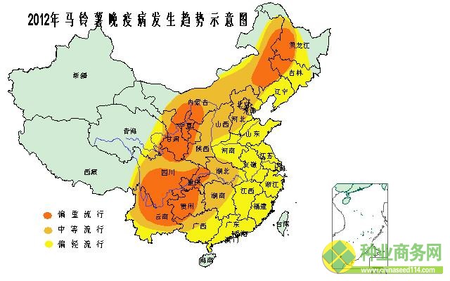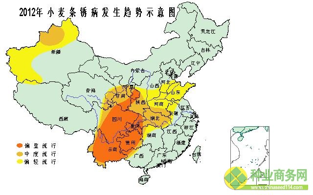 總體中等發(fā)生,程度重于2011年,發(fā)生面積4000萬畝。其中西南大部、西北東部和南部麥區(qū)呈偏重流行態(tài)勢,西北其他地區(qū)、新疆北部、漢水流域、黃淮南部等麥區(qū)中等流行,黃淮北部、華北南部麥區(qū)偏輕流行。