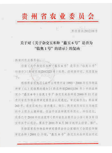 種“蠡玉6號(hào)”是否為“臨奧1號(hào)”的請(qǐng)示》的復(fù)函