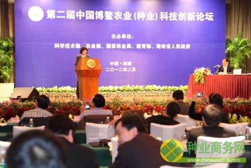 本網(wǎng)訊(記者操戈)2月11日上午,由科技部、農(nóng)業(yè)部、國家林業(yè)局、教育部、海南省政府聯(lián)合主辦的第二屆中國博鰲農(nóng)業(yè)(種業(yè))科技創(chuàng)新論壇在海口召開。為全面貫徹落實2012年中央一號文件和國務(wù)院《關(guān)于加快推進現(xiàn)代農(nóng)作物種業(yè)發(fā)展的意見》精神,本次論壇以“創(chuàng)新引領(lǐng)發(fā)展 做強做大種業(yè)”為主題,重點研討新形勢下我國種業(yè)科技創(chuàng)新體系、育種模式與產(chǎn)業(yè)發(fā)展態(tài)勢及提高我國種業(yè)國際競爭力的措施。中共中央政治局委員、國務(wù)院副總理回良玉發(fā)來賀信,全國政協(xié)副主席、科技部部長萬鋼出席并講話??萍疾?、農(nóng)業(yè)部、教育部、國家林業(yè)局等國家部門分管領(lǐng)導,全國各省、自治區(qū)、直轄市、計劃單列市科技廳(委、局)、新疆生產(chǎn)建設(shè)兵團科技局有關(guān)負責同志,以及全國涉農(nóng)高校、研究院所、種子企業(yè)的專家學者和管理人員500余人參加論壇。