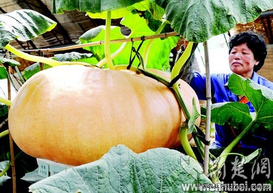 今年年初,河北省秦皇島市農業(yè)技術人員培育出26個特大南瓜。這些巨型南瓜僅生長兩個多月,但有的已超過300斤。預計到秋季,每個南瓜重量有望超過400斤。圖為29日,工作人員在“南瓜王”大棚內工作。