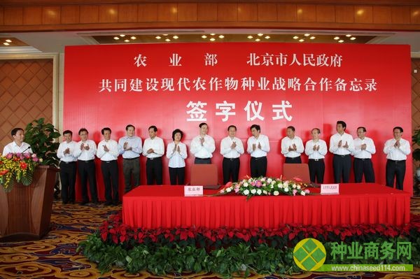 中國(guó)網(wǎng)5月17日訊 5月17日,農(nóng)業(yè)部和北京市政府在北京簽署《共同建設(shè)現(xiàn)代農(nóng)作物種業(yè)戰(zhàn)略合作備忘錄》。這是雙方加強(qiáng)合作,貫徹落實(shí)今年中央1號(hào)文件和國(guó)務(wù)院《關(guān)于加快推進(jìn)現(xiàn)代農(nóng)作物種業(yè)發(fā)展的意見》精神,共同打造國(guó)家農(nóng)作物種業(yè)科技創(chuàng)新中心,推進(jìn)北京現(xiàn)代種業(yè)發(fā)展的重要舉措。按照《備忘錄》,雙方將圍繞打造“種業(yè)之都”的目標(biāo),依托中關(guān)村種業(yè)園區(qū)、通州國(guó)際種業(yè)園、豐臺(tái)種業(yè)會(huì)展和總部功能區(qū)建設(shè),進(jìn)一步整合優(yōu)勢(shì)資源,推進(jìn)體制改革和機(jī)制創(chuàng)新,加大政策扶持和資金投入,著力提升種業(yè)科技創(chuàng)新能力、推進(jìn)創(chuàng)新體制轉(zhuǎn)變、培育種子企業(yè)、加強(qiáng)種子基地建設(shè)、提升管理服務(wù)水平、辦好世界種子大會(huì),提升北京現(xiàn)代種業(yè)發(fā)展水平,率先建立以產(chǎn)業(yè)為主導(dǎo)、企業(yè)為主體、產(chǎn)學(xué)研結(jié)合、育繁推一體化現(xiàn)代農(nóng)作物種業(yè)。農(nóng)業(yè)部部長(zhǎng)韓長(zhǎng)賦、北京市市長(zhǎng)郭金龍出席了簽署儀式。