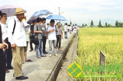 當(dāng)天上午9時(shí)左右,參觀團(tuán)一行60余人冒著酷暑到西湖村田間察看,只見進(jìn)入成熟期的稻田金黃色一片,一派豐收的景象。參觀團(tuán)成員不時(shí)發(fā)出一聲聲贊許:“這片早稻良種田種得真不錯(cuò)!”