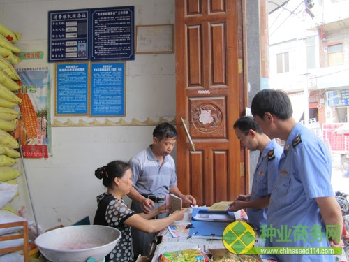 圖為工商執(zhí)法人員日常檢查農(nóng)資經(jīng)營戶的情景