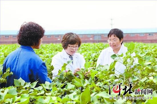 近日,張香云(中)和科研人員一起在棉花試驗田察看棉花長勢。 杜海英攝