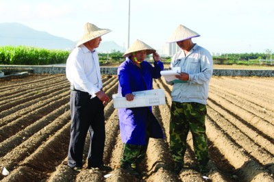 “注意株距,拉桿時別把種子移位了。”11月23日,在海南省三亞市南濱農(nóng)場登海育種基地高產(chǎn)玉 米試驗(yàn)田里,頭戴黎族三角帽的李登海,冒著30攝氏度的高溫指導(dǎo)育種隊(duì)員們播種。