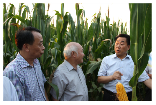 河南省委常委、副省長劉滿倉在了解到偉科702的情況后,特別會同河南省農(nóng)業(yè)廳等部門專程視察了偉科702在新鄉(xiāng)七里營的千畝示范田。在了解到偉科702可以將目前的玉米單產(chǎn)提高5%以上時,他高興的對陳偉程教授說:“感謝你繼豫玉22后,又為河南培育出一個玉米好品種,希望偉科702能為河南乃至全國的糧食生產(chǎn)做出大貢獻(xiàn)!”(圖為省委常委、副省長劉滿倉視察偉科702千畝示范田)