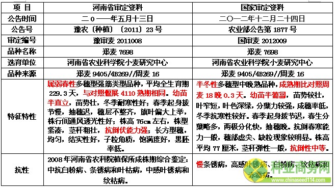 二○一二年十二月二十四日農(nóng)業(yè)部公告第1877號公布了審定的農(nóng)作物品種,筆者發(fā)現(xiàn):河南省農(nóng)業(yè)科學院小麥研究中心選育“鄭麥7698”,在國家審定及河南省審定公告的品種資料中,品種特征特性大相徑庭,令人大跌眼鏡。國家審定的“鄭麥7698” 為半冬性品種,成熟期比對照周麥18晚0.3天,幼苗半葡匐,抗倒性中等。而河南省審定的“鄭麥7698” 屬弱春性,生育期與對照偃展4110熟期相同,幼苗半直立,抗倒伏能力強。同時,在國審“鄭麥7698”的抗病性描述中有這樣一句話:“慢條銹病,高感葉銹病、白粉病、紋枯病和赤霉病。”,讓筆者很難理解其中之意。