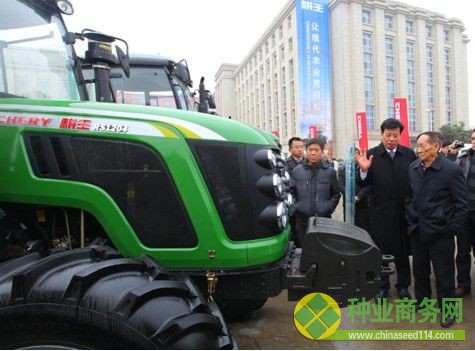圖為袁隆平院士觀摩奇瑞耕王拖拉機(jī)