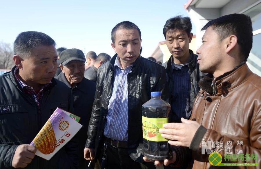 2月21日,什兵地村的村民在一家種子經(jīng)銷(xiāo)公司的展臺(tái)前了解種子情況。當(dāng)日,內(nèi)蒙古呼和浩特市土默特左旗察素齊鎮(zhèn)什兵地村舉行農(nóng)資展銷(xiāo)活動(dòng),引導(dǎo)農(nóng)民使用優(yōu)質(zhì)種子和化肥,以提高農(nóng)業(yè)種植效益。來(lái)自全區(qū)10多家農(nóng)資企業(yè)和經(jīng)銷(xiāo)公司來(lái)到該村,向農(nóng)民展銷(xiāo)70多種品牌的種子、化肥、地膜等農(nóng)用物資。新華社記者 任軍川 攝