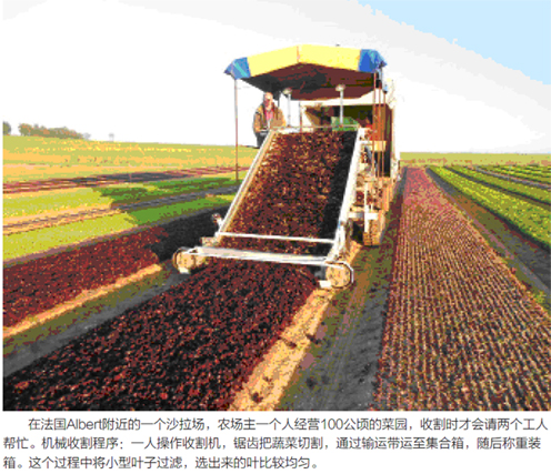 在法國(guó)Albert附近的一個(gè)沙拉場(chǎng),農(nóng)場(chǎng)主一個(gè)人經(jīng)營(yíng)100公頃的菜園,收割時(shí)才會(huì)請(qǐng)兩個(gè)工人幫忙。機(jī)械收割程序:一人操作收割機(jī),鋸齒把蔬菜切割,通過(guò)輸運(yùn)帶運(yùn)至集合箱,隨后稱重裝箱。這個(gè)過(guò)程中將小型葉子過(guò)濾,選出來(lái)的葉比較均勻。