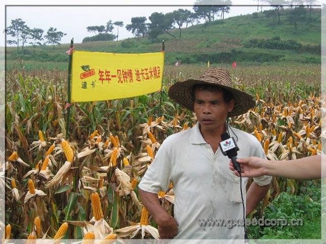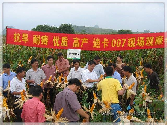 第二,切實(shí)按照廣西區(qū)種子公司百色分公司示范具體要求進(jìn)行大膽試驗(yàn)推廣。試驗(yàn)一,在百樂鄉(xiāng)示范點(diǎn)面上用當(dāng)家品種蘇灣一號(hào)與迪卡007簡(jiǎn)易對(duì)比試驗(yàn),在同一坡地、同一向陽坡面、種植面積均等,測(cè)產(chǎn)驗(yàn)收蘇灣一號(hào)為畝產(chǎn)172 .5公斤,迪卡007為畝產(chǎn)484公斤,經(jīng)對(duì)比種植迪卡007比種植當(dāng)家老品種增產(chǎn)增效十分顯著。試驗(yàn)二、在示范點(diǎn)試種品種27個(gè),篩先出具有推廣價(jià)值迪卡007后繼品種12個(gè)(按畝產(chǎn)500公斤以上排列);示范片迪卡007面積134畝,經(jīng)測(cè)產(chǎn)驗(yàn)收畝產(chǎn)554.36公斤。其它示范點(diǎn)(17個(gè)鄉(xiāng)鎮(zhèn)),面積都在30畝以上連片,各生長(zhǎng)時(shí)期長(zhǎng)勢(shì)喜人,經(jīng)驗(yàn)收最低畝產(chǎn)417公斤,最高畝產(chǎn)577公斤。試驗(yàn)三,在面上平塘鄉(xiāng)平塘村6組王福祥自留旱坡地 5.6畝,2002年開始試種迪卡0071.5畝,收獲玉米干籽粒732公斤,折合畝產(chǎn)488公斤,當(dāng)年種植當(dāng)年見效,嘗到了甜頭,至今連續(xù)四年種植迪卡007。浪平鄉(xiāng)委貴村農(nóng)民滕益權(quán)堅(jiān)持四年種植迪卡007,年種100多斤,年收20000多元,人均收入在5000元以上。全家由貧到富,喜上眉梢。象滕益權(quán)這樣的例子在田林縣特別是土山鄉(xiāng)鎮(zhèn)比比皆是。