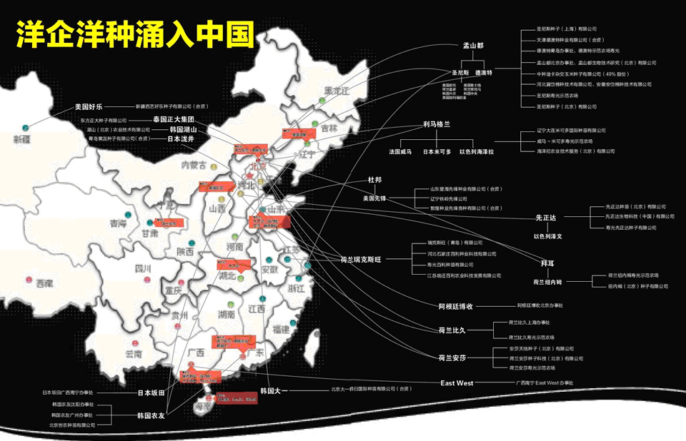 種業(yè)差不多算是外資最后進(jìn)入的一個(gè)行業(yè),但如果不是受外商投資政策限制,或許早已亮起了紅燈。從某位農(nóng)戶使用上第一粒外資企業(yè)提供的種子開始,外資便快速涌入進(jìn)來。據(jù)統(tǒng)計(jì)數(shù)據(jù)顯示,目前在我國(guó)共有35家跨國(guó)種子企業(yè)在農(nóng)業(yè)部注冊(cè),其中經(jīng)營(yíng)玉米的有5家企業(yè),經(jīng)營(yíng)棉花的有2家,其余28家主營(yíng)蔬菜和花卉,不少跨國(guó)公司在中國(guó)注冊(cè)成立分公司,或與國(guó)內(nèi)種企共同投資成立合資公司。[詳細(xì)]