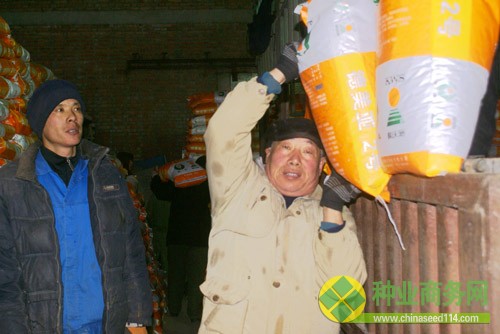 下擺工作。圖為農戶們正在卸載玉米種子。