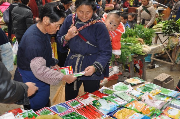 3月16日,貴州省榕江縣忠誠(chéng)鎮(zhèn)的種子市場(chǎng)上,兩位侗族婦女正在選購水稻、玉米、蔬菜等良種。