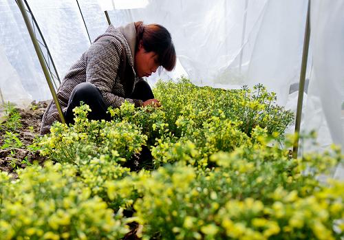 一位農(nóng)民在季核亮的試驗(yàn)大棚中為出于蕾期的白菜花進(jìn)行人工授粉(3月20日攝)。新華社記者 張超群 攝