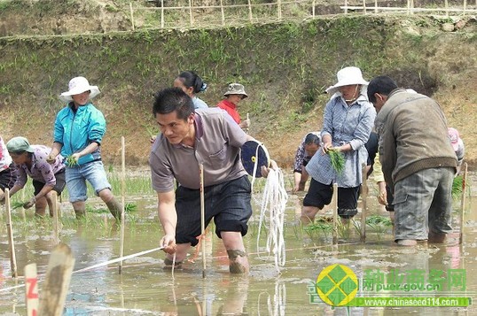 科技人員和村民的配合下,在富永村實施秧苗移栽工作。