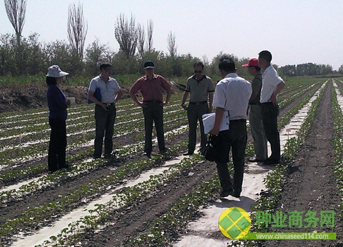 兵團(tuán)種子管理總站品種管理科科長何新河(左二)在三十團(tuán)試驗田檢查指導(dǎo)。