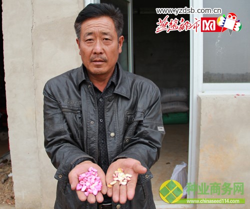 據(jù)陳先生介紹,花生種涂抹農(nóng)藥的時(shí)間為4月20日,而播種的時(shí)間在5月10日左右,時(shí)間相隔20天對種子發(fā)育十分不利,這也是造成種子不能正常發(fā)芽的關(guān)鍵所在。 種子過硬不能正常發(fā)芽,幾位村民表示十分認(rèn)可,但造成種子過硬的原因,他們卻認(rèn)為是農(nóng)藥涂抹劑量過重,而非時(shí)間過長。在田地里,耿萬貴拿出了幾把涂抹了農(nóng)藥的花生種與自己涂藥的種子進(jìn)行對比,經(jīng)零售商涂抹過農(nóng)藥的種子藥物已經(jīng)沁入內(nèi)層,清晰看見一層紫色的藥物將種子的表皮包裹。