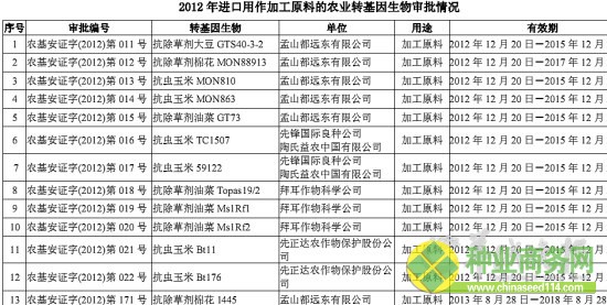 | 2012年進(jìn)口用做加工原料的農(nóng)業(yè)轉(zhuǎn)基因生物審批情況截圖(圖片來源:農(nóng)業(yè)部網(wǎng)站) |