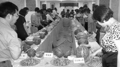 圖為觀摩會(huì)現(xiàn)場(chǎng)參觀者品嘗瓜菜新品種。