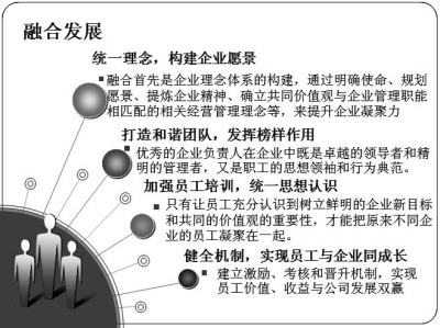 張琴:兼并重組不是簡(jiǎn)單的疊加和拼湊兩個(gè)企業(yè),更需要將雙方優(yōu)秀的部分進(jìn)行融合和升華,優(yōu)勢(shì)互補(bǔ),優(yōu)缺相濟(jì)。融合首先是企業(yè)理念體系的構(gòu)建,通過(guò)明確使命、規(guī)劃愿景、提煉企業(yè)精神、確立共同價(jià)值觀與企業(yè)管理職能相匹配的相關(guān)經(jīng)營(yíng)管理理念等,提升企業(yè)凝聚力。其次,榜樣的力量是無(wú)窮的,優(yōu)秀的企業(yè)負(fù)責(zé)人既是卓越的領(lǐng)導(dǎo)者和精明的管理者,又是職工的思想領(lǐng)袖和行為典范,對(duì)打造和諧團(tuán)隊(duì)意義重大。再次,加強(qiáng)員工培訓(xùn)是統(tǒng)一思想認(rèn)識(shí)的有效途徑。只有讓員工充分認(rèn)識(shí)到樹(shù)立鮮明的企業(yè)新目標(biāo)和共同的價(jià)值觀的重要性,才能把原來(lái)不同企業(yè)的員工凝聚到一起。