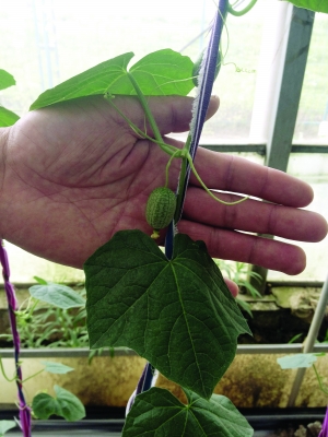 昨天下午,現代快報記者在無錫市黃土塘農業(yè)發(fā)展有限公司的一處實驗田里,見到了這種特別的西瓜。“拇指西瓜”的個頭如櫻桃番茄般大小,十分可愛。瓜上的花紋則和普通的西瓜一樣,呈淡綠色。有趣的是,與普通西瓜在田地里打“地鋪”不同,拇指西瓜是吊在空中的,瓜秧會沿著秧架攀爬。