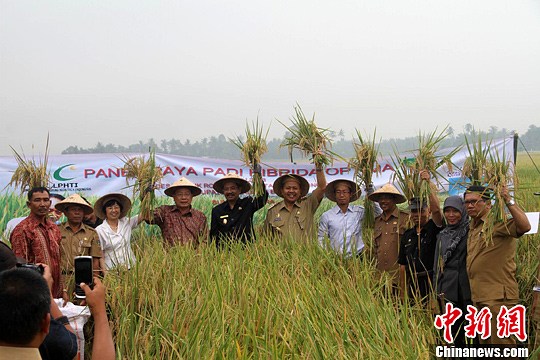 7月16日,由中國(guó)隆平高科(印尼)OPTIMA水稻公司與印尼蘇鋼集團(tuán)合作,在蘇北省昔里冷勿拉涯縣網(wǎng)眼鎮(zhèn)魯布羅丹村設(shè)立的水稻實(shí)驗(yàn)田舉行試種成功收割現(xiàn)場(chǎng)會(huì)。顧時(shí)宏 攝 中新社印尼棉蘭7月16日電 (記者 顧時(shí)宏)由中國(guó)隆平高科(印尼)OPTIMA水稻公司與印尼蘇鋼集團(tuán)合作,在蘇北省昔里冷勿拉涯縣網(wǎng)眼鎮(zhèn)魯布羅丹村設(shè)立的水稻實(shí)驗(yàn)田16日舉行試種成功收割現(xiàn)場(chǎng)會(huì)。