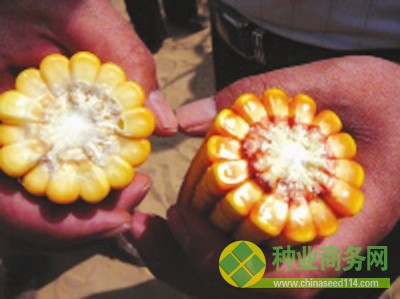 農(nóng)民對(duì)比普通玉米(右)和假種子玉米