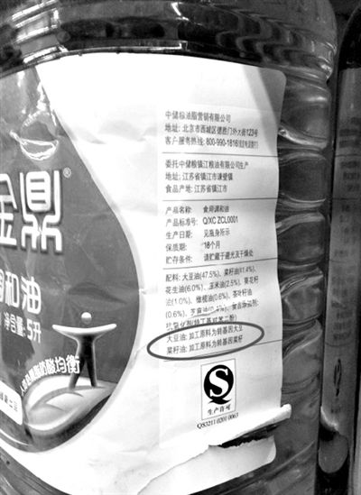 使用轉基因原料的食用油的標識則隱蔽得多。在某品牌的一款食用調(diào)和油上,“加工原料為轉基因大豆”,“加工原料為轉基因油菜籽”的字樣則“躲”在營養(yǎng)成分表上方以同樣大小的黑色字體顯示。而在一款1.8L裝某品牌玉米胚芽油上,記者則沒有找到是否使用轉基因原料加工的標識說明。