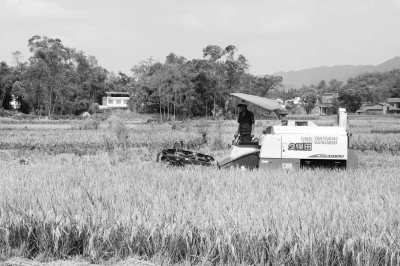 圖為機(jī)收隊(duì)在梁平縣和林鎮(zhèn)和林村收割制種水稻。