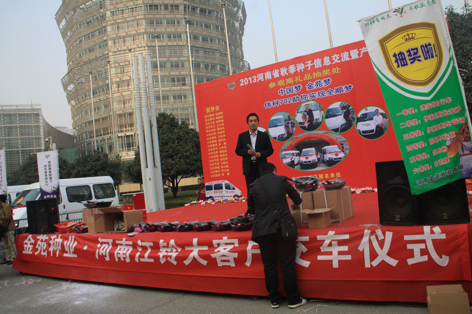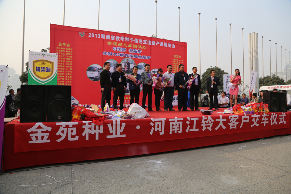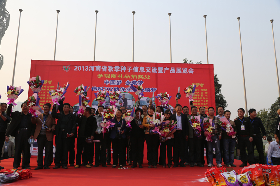 10月24日上午,2013河南省秋季種子信息交流暨產(chǎn)品展覽會在鄭州國際會展中心開幕。偉科702是本次會議的最熱門品種,也是繁育推廣面積增長最快的玉米新品種(河南省種子管理站站長毛景英在種子信息發(fā)布會上報告中明確指出)。偉科702選育推廣單位金苑種業(yè)斥資600萬元開展的“國經(jīng)銷商頒獎儀式”會議推向高潮。42名來自河南、河北、山東、安徽等省份的優(yōu)秀經(jīng)銷商通過與金苑種業(yè)合作,共同推廣偉科702玉米種實現(xiàn)了自己的全順夢,喜獲福特、江鈴、全順汽車(每輛汽車價值15萬左右)。