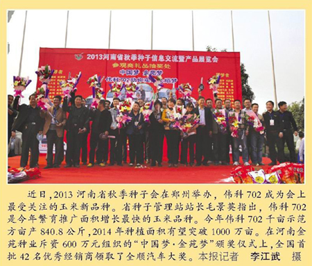 O 2013金苑種業(yè)偉科702觀摩會 O 劉滿倉:借鑒先進經(jīng)營模式 做好偉科702推廣 O 玉米新品種“偉科702”獲院士稱贊 潛力巨大