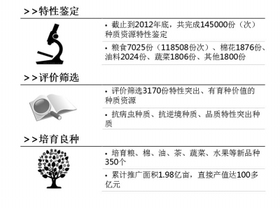 相關科研單位利用這些優(yōu)異種質(zhì),培育出糧、棉、油、茶、蔬菜、水果等新品種350多個,推廣面積1.98億畝,產(chǎn)生了巨大的社會經(jīng)濟效益,直接產(chǎn)值達100多億元。