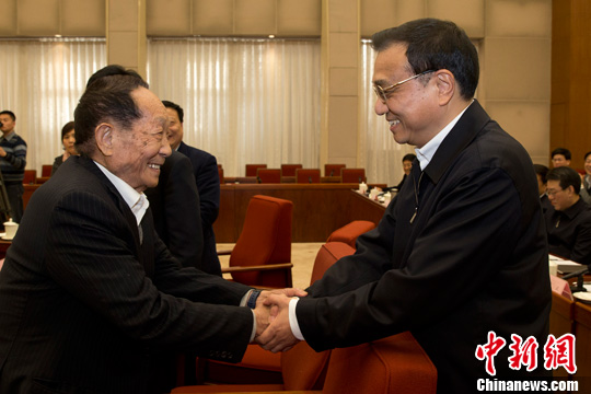 中國國務(wù)院總理李克強1月17日在中南海主持召開座談會,聽取教育、科技、文化、衛(wèi)生、體育界人士和基層群眾代表對《政府工作報告(征求意見稿)》的意見和建議。圖為李克強與參加座談會的袁隆平握手。中新社發(fā) 盛佳鵬 攝