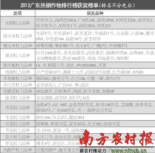 南方農(nóng)村報(bào)訊 (記者惠婷婷)誰是2013廣東熱銷作物權(quán)力品種?誰是種植戶心中的心水品種?經(jīng)過近一個(gè)月的人氣投票及專家審核后,2013廣東熱銷作物權(quán)力品種排行榜結(jié)果火熱出爐,最終93個(gè)品種突出重圍,獲得殊榮。此次活動(dòng)從品種征集到投票評選,通過會議、報(bào)紙、雜志、網(wǎng)絡(luò)、微信、手機(jī)等多種渠道進(jìn)行了廣泛宣傳。進(jìn)入榜單的59家種企的222個(gè)品種均在2013年種子市場有售并在當(dāng)?shù)厥袌鋈〉眉芽儯駟瘟D打造代表市場動(dòng)向的權(quán)威平臺。