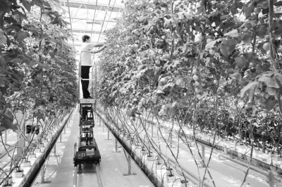 壽光市蔬菜種業(yè)集團(tuán)育種基地內(nèi),技術(shù)人員在荷蘭模式智能溫室修剪番茄?!≠Y料圖