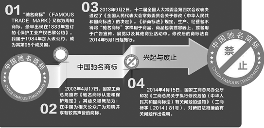 2013年8月30日,《新商標(biāo)法》通過全國人大表決,其第五十三條中規(guī)定"生產(chǎn)、經(jīng)營者不得將'中國馳名商標(biāo)'字樣用于商品、商品包裝或者容器上,或者用于廣告宣傳、展覽以及其他商業(yè)活動中,發(fā)現(xiàn)違規(guī)由地方工商行政管理部門責(zé)令改正,處十萬元罰款",隨后,對中國馳名商標(biāo)禁用的話題就不斷被發(fā)酵。