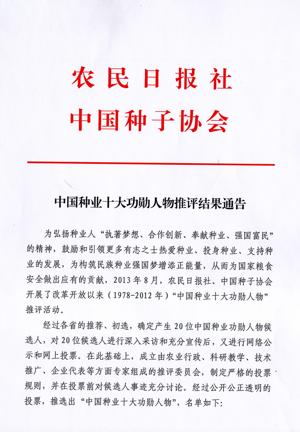 中國(guó)種業(yè)十大功勛人物簡(jiǎn)要事跡